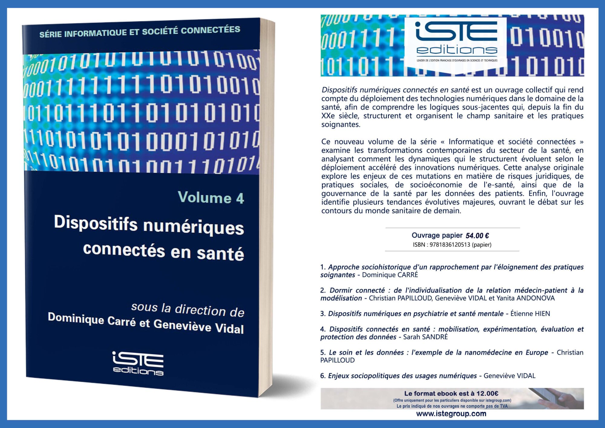 Dispositifs numériques connectés en santé est un ouvrage collectif qui rend compte du déploiement des technologies numériques dans le domaine de la santé, afin de comprendre les logiques sous-jacentes qui, depuis la fin du XXe siècle, structurent et organisent le champ sanitaire et les pratiques soignantes.